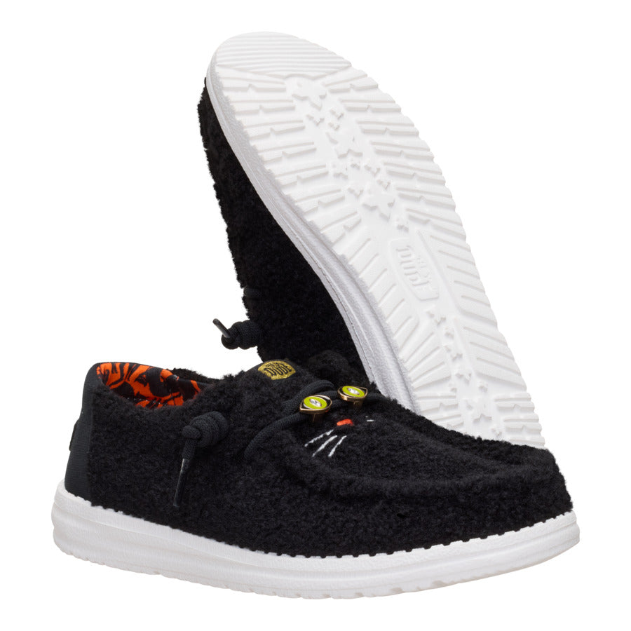 Somethingpurr-fectly spooky this way comes?? Meet the Wendy Black Cat. the fluffiest little fright your feet will ever love! Covered in soft. black sherpa and rocking a mischievous cat face (complete with pointy ears and plenty of cattitude). this cozy creature is here to claw its way into your heart??and your closet. With a lightweight feel. slip-on magic. and eerily good comfort. they’re perfect for casting cozy spells. dodging bad luck. or just creeping it real.
