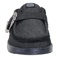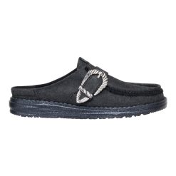 Comfier than cowboy boots. The Wendy Slip Buckle Denim has a Western aesthetic with a slipper-like feel. The upper’s made from lightweight textile. with a big metal buckle and subtle fringe.